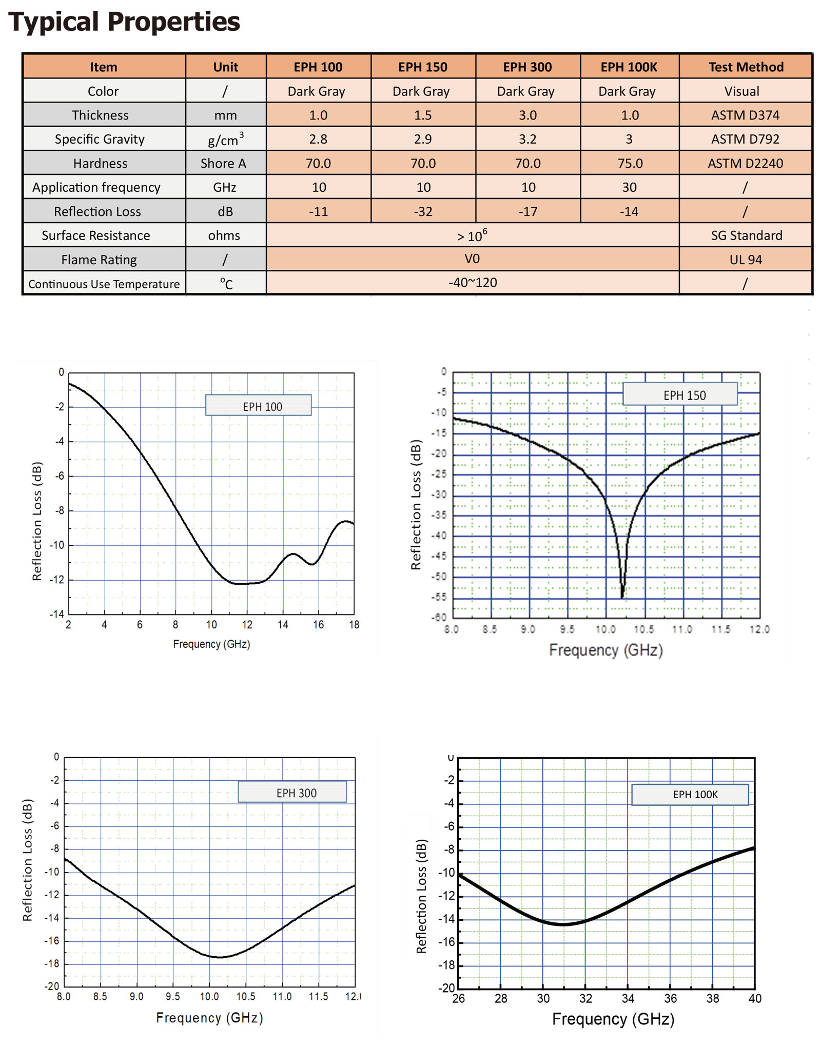 TM EPH系列是一種由高磁導率合金粉末和橡膠混合、分散、壓制而成的高頻吸收材料。該材料可以通過絕緣損耗、磁損耗和阻抗損耗將電子設備發射的電磁波轉化為熱能來減少電磁輻射。" />