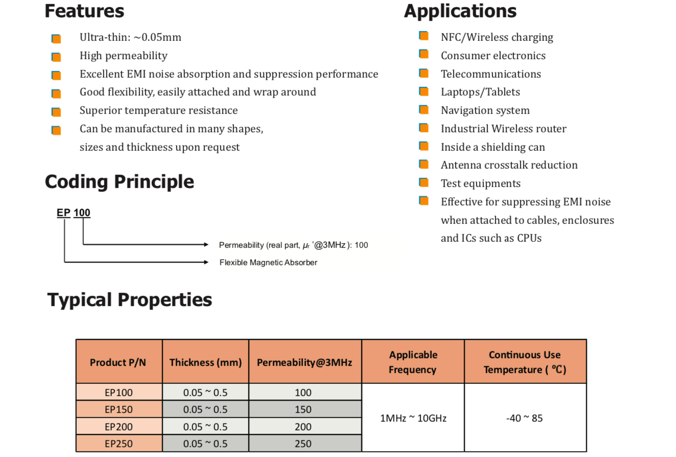 TM EP系列柔性磁吸收材料設計用于抑制電子設備產生的有害電磁波和高頻噪聲。本產品還可用于保護產品免受外部噪音的影響,從而減少由相鄰電子產品的電磁波引起的故障和干擾。" />