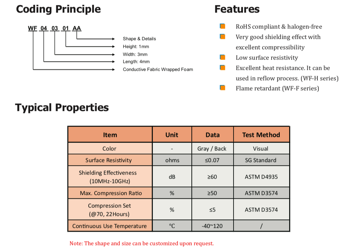 TM WF系列導電布包裹泡棉由高導電織物、PU泡棉芯和 導電壓敏丙烯酸粘合劑。這些高度可壓縮的材料專門設計用于 提供卓越的EMI屏蔽和接地性能,并提供高度防塵和防潮保護。 EM-WF系列產品容易調整尺寸所以特別適用于計算機、智能手機、液晶顯示器/電視和電信制造行業的固定墊圈應用。" />